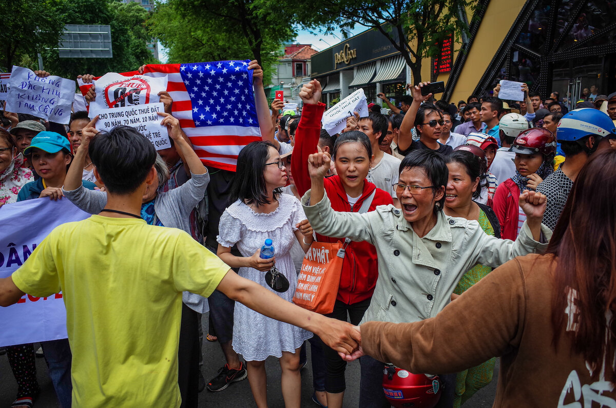 Согласно спорному законопроекту о ОЭЗ, земля в зонах может быть арендована иностранными инвесторами на срок до 99 лет. Протестующие опасались, что эти самоуправляющиеся зоны будут полностью контролироваться китайскими инвесторами таким образом, что суверенитет над ними отойдет к гигантскому северному соседу Вьетнама. Поэтому многие из протестующих несли антикитайские плакаты, в том числе те, в которых говорилось: «Не сдавать землю в аренду Китаю даже на один день», «Сдача земли в аренду Китаю продает страну врагам вьетнамского народа», и «Китай, выходи из Вьетнама». При этом, как и полагается по законам продвижения в массы «цветных революций», некоторые протестующие несли американские флаги и антикоммунистические лозунги, такие как «Долой коммунистов» и «Долой предателей», «Вы можете посадить революционера, но не можете посадить революцию», а вьетнамских протестующих, выкрикивающих лозунги против предложенного закона о ОЭЗ во время демонстрации в Хошимине, фотографировал (совершенно «случайно» оказавшийся в это время в городе) американский активист и одновременно «коммунистический революционер» Хьюи Ньютон (Huey Newton).