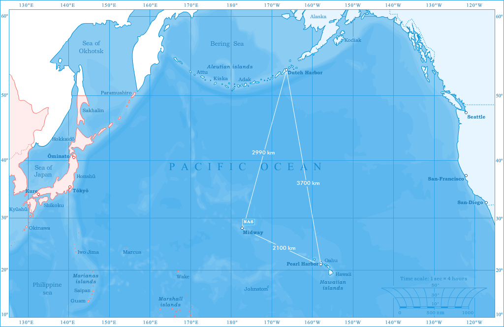 Не будем забывать, что речь идёт о Тихом океане с его огромными расстояниями. Для лучшего понимания стóит вспомнить, что расстояние от Пёрл-Харбора до Мидуэя составляет 1134 мили [2100 км], а от Пёрл-Харбора до Датч-Харбора 1996 миль [3700 км], и это по кратчайшим маршрутам (по дуге большого круга). То есть переброска туда кораблей заняла бы, как минимум, 75,6 и 133 часа соответственно (экономическим ходом в 15 узлов [28 км/ч]). При этом японские самолёты появились над Датч-Харбором 3 июня 1942 г. в 03.45, а над Мидуэем – 4 июня в 06.35.