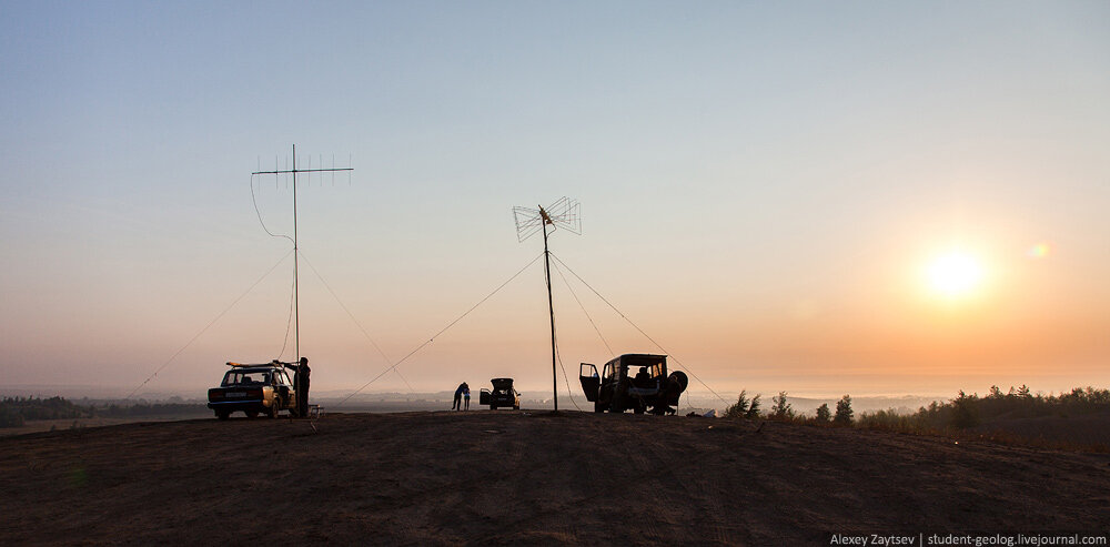 Тульская область известна своими запасами угля. Однако в период 80-90х годов угольная промышленность области пришла в упадок и стали закрываться не только отдельные шахты (вспомним шахту "Никольскую", где мы были несколько лет назад), но и целые разрезы. В напоминание о себе производства оставляли терриконы - огромные отвалы выработанной породы. Так и образовались Романцевские горы, место куда мы сегодня поедем. Изначально я планировал приехать на Романцевские горы к рассвету и выехал около 3 ночи, но немного не успел. Солнце уже взошло над горизонтом. Несмотря на ранний час на вершине уже были Тульские радиолюбители: Олег и его товарищ уже много десятков лет занимаются радиообщением. Расцвет радиолюбительства пришелся на 70-е годы прошлого века, но сегодня энтузиастов осталось очень немного. Тем не менее, проводятся соревнования, переклички и слеты. Я честно попытался понять в чем изюминка этого увлечения: радиообщение это что-то вроде современных социальных сетей, с той лишь разницей