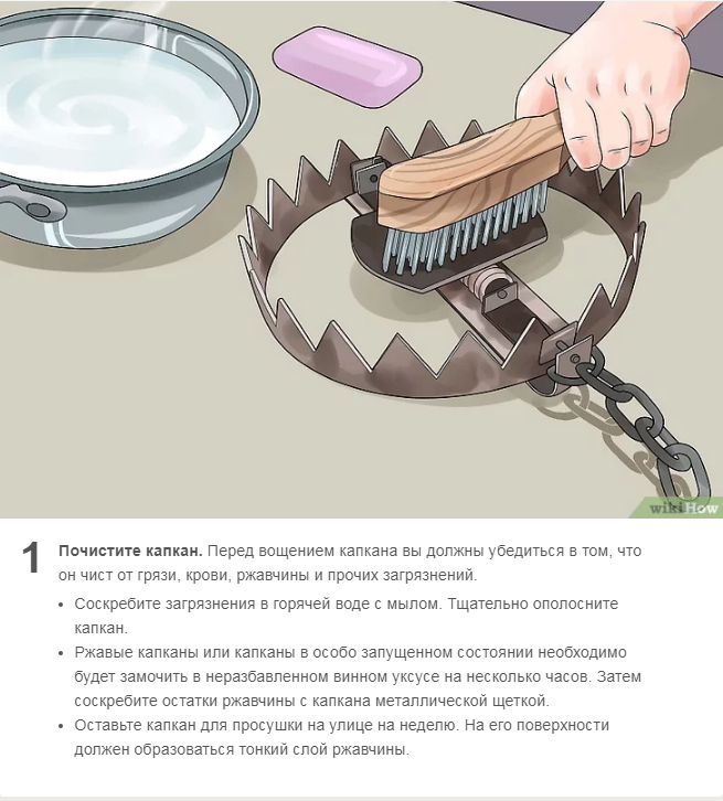 Читска капканов снижает идущий от них запах метала, снижая тем самым их заметность перед животными. Так же чистка капкана защищает его от ржавчины и позволяет пружинам срабатывает как нужно! Что нам нужно: Для чистки Для чернения Для вощения Подготовка капкана Вощение капкана