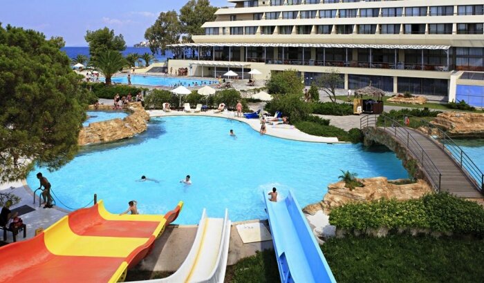 Среди туристов бытует мнение, что в Греции не так уж много гостиниц с водными горками, но это на поверку не так. Туроператоры — члены АТОР сделали подборку греческих отелей, на территории которых работают аквапарки. Всего на курортах страны эллинов таких отелей не менее 25, их звездность — в диапазоне от «четверок» до Deluxe, во многих из них также действует система FB или «все включено». Представляем вам несколько интересных вариантов на разный вкус и бюджет. 6. Porto Carras Grand Resort 5*, Халкидики Этот гостиничный комплекс класса Lux находится на одном из «пальцев» полуостров, в Ситонии, здесь любят отдыхать взрослые и дети. На территории два открытых бассейна с морской водой (один из них напоминает лагуну), в детском бассейне установлена водная горка. Кроме этого, в гостинице работает SPA и лечебный центр, а также имеется масса развлечений: теннисные корты, гольф- и футбольное поля, ночной клуб, марина для яхт, казино. Комплекс даже занимается экологичным виноградарством и вино