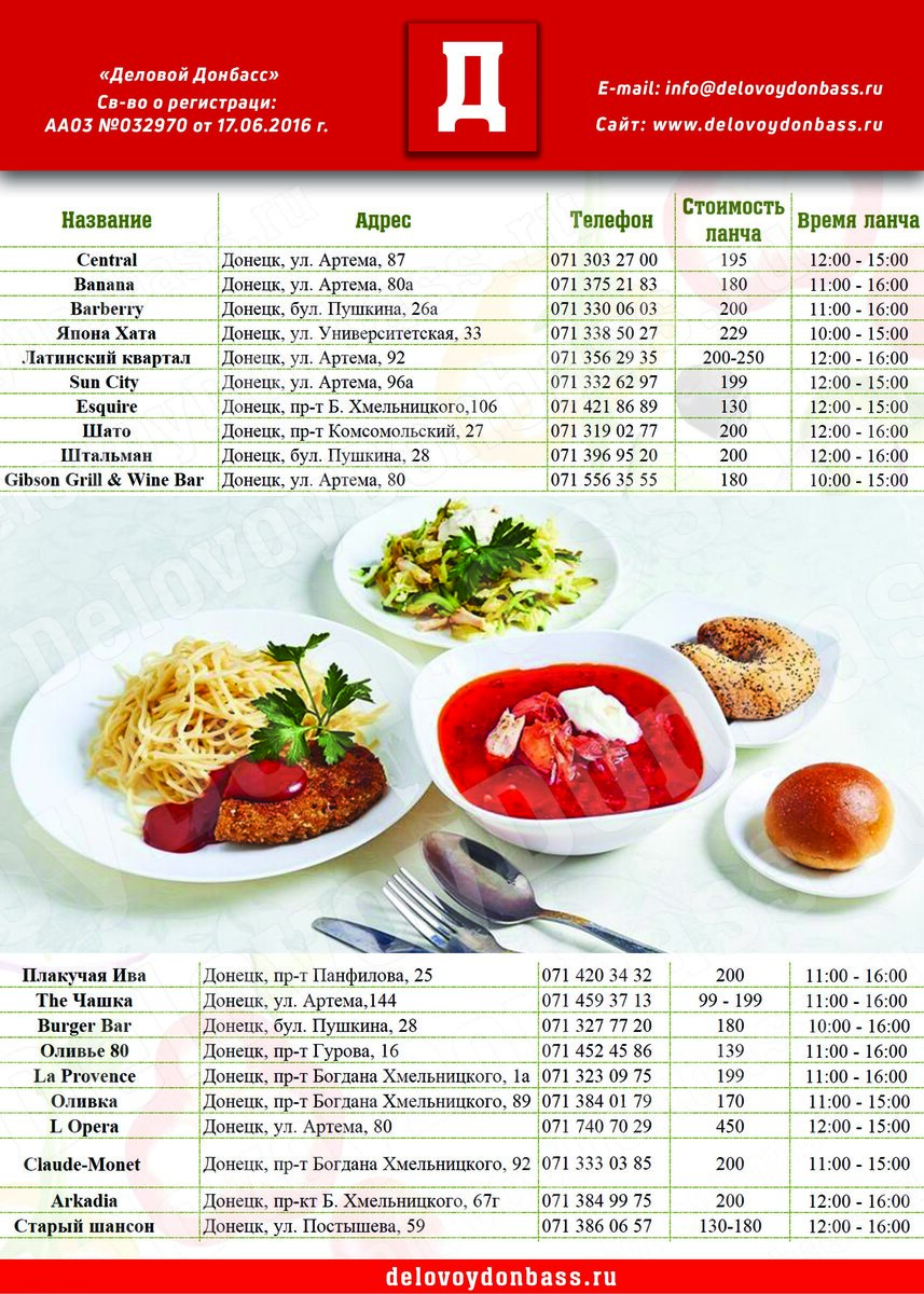 Деловой Донбасс провел собственный мониторинг и выявил заведения, где можно заказать «business lunch» в Донецке. Мы нашли 73 рабочих заведения, из них 20 заведений предоставляют бизнес ланчи. Адреса и контактные данные представлены ниже.