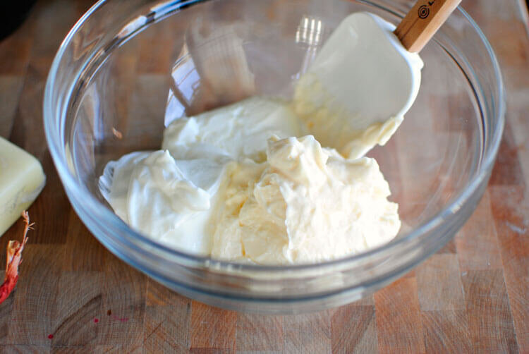 - Достаньте из холодильника сыр, он должен быть мягким и теплым, Что позволит ему лучше взбиться. Переложите всю порцию сыра в чашу миксера, взбивайте около 3 минут на средней скорости.
