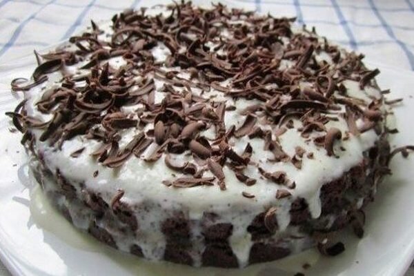 - 2 Чтобы корж после выпечки был ровным, необходимо в тесте сделать небольшую воронку ложкой, распределяя тесто ближе к краям. Готовый пирог остудить и разрезать вдоль на две ровные половинки. Сметану взбить с сахаром в пышную массу. Промазать слои тортика сметанным кремом, сверху украсить тертым шоколадом. Шоколадный торт «Обыкновенное чудо» должен пропитаться в течение суток.