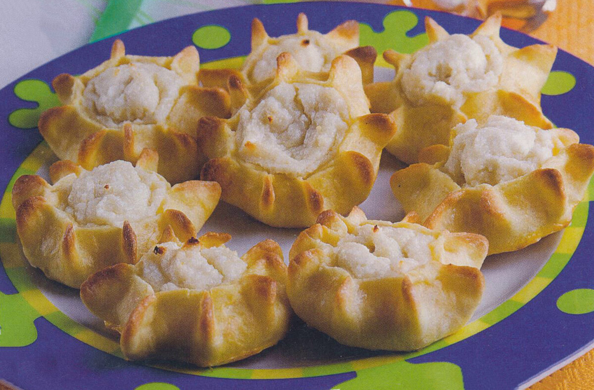 Ингредиенты: 2 стакана муки, 250 гр. творога, 3 яйца, 1 стакан молока, 4 столовые ложки сахара, 2 столовые ложки сливочного масла, соль Способ приготовления: В кастрюле смешать муку, 2 яйца, добавить молоко и одну столовую ложку сливочного масла, перемешать продукты и замесить тесто. Сверху кастрюлю накрыть вафельным полотенцем и поставить в холодильник на 30 минут для охлаждения. В отдельной посуде смешать творог, сахар и соль. Начинка должна получиться не жидкая. Если начинка получилась жидкой, то необходимо в неё добавить одну столовую ложку муки и хорошо перемешать. Достать кастрюлю с тестом из холодильника и раскатать тесто в пласт толщиной примерно 5 миллиметров. Взять специальную круглую форму и с её помощью вырезать из теста кружочки. На серединку каждого кружочка положить начинку из творога. К творогу можно добавить изюм, измельчённые орехи или цедру апельсинов. Аккуратно защипнуть кружочки таким образом, чтобы у Вас получились восьмиугольные розочки. Затем оставить ватруш