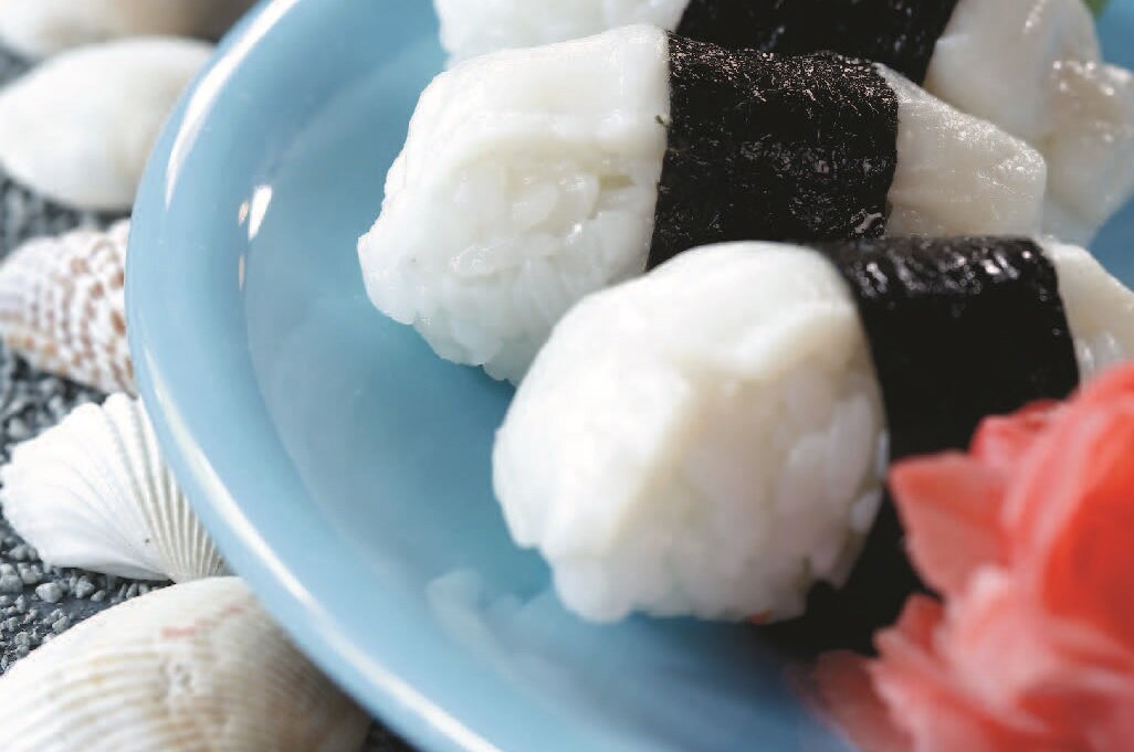 Ингредиенты 20 г отварного риса 12 г морского гребешка Полоска нори Готовим Стандартно формируем комочек из примерно 20 г риса и режем гребешок. Положите гребешок на 10 мин в морозилку – вам так легче будет его нарезать. Как и в рецепте с угрем, используем водоросли нори. Режем пластинку водорослей по линиям, гребешки положим на комочек из риса и обвернем полоской нори, надавим слегка рукой, что-бы придать обтекаемость и форму. Комментарий Рыба и моллюски с ракообразными, идущие на приготовление суши, прежде всего должны быть свежими, поскольку в большинстве случаев их едят в сыром виде. Покупая куски рыбы, убедитесь, что мякоть твердая и блестит и кровь на срезах ярко-красная. Поскольку при мытье кусков рыбы ее мясо теряет вкус и делается рыхлым, лучше всего покупать рыбу целиком и разделывать ее дома.