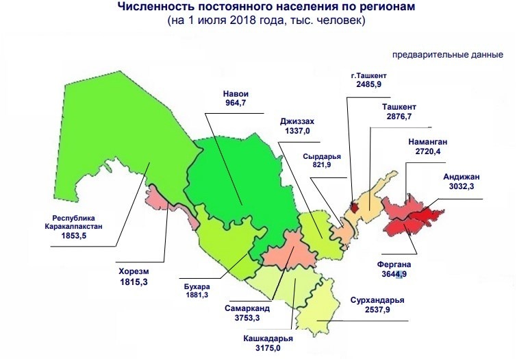 НАСЕЛЕНИЕ УЗБЕКИСТАНА ПРИБЛИЗИЛОСЬ К ОТМЕТКЕ В 33 МИЛЛИОНА На 1 июля 2018 года в Узбекистане проживало 32 миллиона 900 тысяч 100 человек, сообщает Госкомстат. За год население выросло на 243,4 тыс. человек или на 0,7 %. При этом 50,6 % людей проживало в городах. На первом месте по численности Самаркандская область-3753,3 тыс. человек, меньше всего в Сырдарьинской — 821,9 тыс. человек. По рождаемости лидируют Сурхандарья, Самарканд и Кашкадарья.