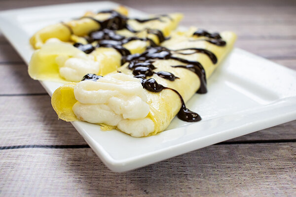 Превратите свой утренний завтрак в изысканный и полностью удовлетворяющий десерт со сливочным заварным кремом и декадентским шоколадным соусом. См. Больше наших восхитительных идей десерта :0 Для заполнения: 1/2 стакана сахара 1/4 стакана кукурузного крахмала 1/2 ч.л. соли 1 1/2 стакана молока 4 яичных белка 1 ч.л. экстракта ванили 1/2 чашки тяжелых взбитых сливок Кастрюля: молоко, сахар, кукурузный крахмал и соль на среднем огне. Перемешать до сгущения Налейте 1/3 смеси сахара в яичные белки и перемешайте, вернитесь в кастрюлю и нагрейте в течение 1 минуты. Удалите кастрюлю с жары и вылейте ваниль. Перенесите его в среднюю миску, накройте и нанесите пластиковую пленку на верхнюю часть смеси. Охладите 1-2 часа. Формируются тяжелые взбитые сливки до жестких пиков. Сложите в наполняющую смесь. Чтобы сделать крепированное тесто: 1 1/2 стакана молока 4 яйца 1/2 ч.л. экстракта ванили 1 чашка муки 1 1/2 ч.л. сахара 1/8 ч.л. соли 8 ч.л. масла Взбейте молоко и яйца. Смешайте муку, сахар и с