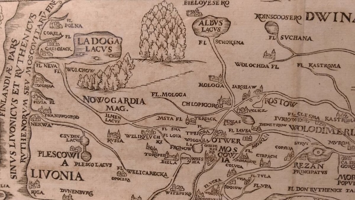 Это фрагмент знаменитой карты Московии Сигизмунда фон Герберштейна, опубликованной в 1549 году. Судя по ней, о делах московитских барон был осведомлен действительно очень хорошо. Сердце Руси Великой изображено схематично, но подробно. Вот Калуга, вот Серпухов, вот Воротынск и Одоев. Вот Торопец и Белый. А вот Сухона, Шексна, лакус Альбус и лакус Ильмень. Но почему, спросите вы, нам показывают посредственную фотографию карты, которую можно без труда найти в интернете в нормальном качестве? А потому, ответим мы, что есть такие карты, которые лучше поразглядывать живьем. Коллективу «Вечернего канала» удалось сделать это в позапрошлые выходные на выставке «От Московии к Империи» в усадьбе Муравьевых-Апостолов, что на Старой Басманной. Кстати, это музей, который так и хочется назвать уникальным. Вот всего три факта: - Деревянный дом сенатора Муравьева-Апостола (отца декабриста) пережил пожар 1812 года. Фрагмент сруба можно увидеть внутри. - Музей был создан в начале 2000-х по инициативе