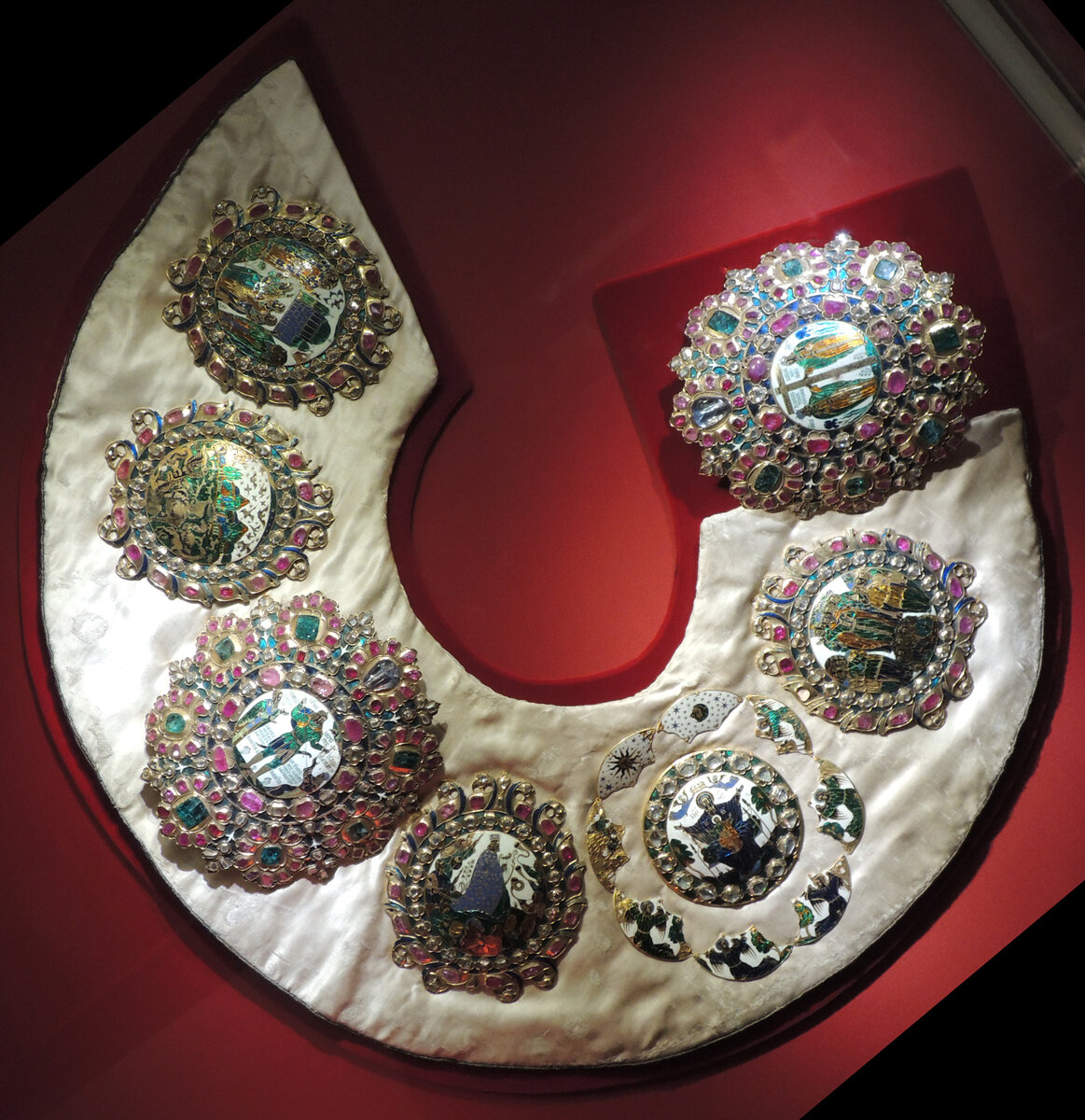 "Бармы" -- это монаршья регалия, которая была очень важна для наших царей, а вот нигде больше не употреблялась. Брошки на воротник, грубо говоря. Считается, что обычай мы этот восприняли у Византии. В Оружейной палате сохранилось несколько очень красивых. Вот одна из них, так называемые Бармы царя Алексея Михайловича "греческой работы" (также почему-то называемые "диадема"). Это одна из самых ценных царских (не императорских) регалий России. В целом все 7 медальонов «диадемы» содержат 248 алмазов и 255 других драгоценных камней. История их созданий такова. В 1662 г. греческий купец и ювелир Иван Юрьев привез царю державу, а также бармы изящной работы, которые и сейчас являются украшением Оружейной палаты Московского кремля. Как отмечают старинные источники Оружейной палаты, «диадема» сделана «против образца диадимы благочестиваго Греческаго Царя Константина». Пояснительные надписи на запонах сделаны на греческом языке. Носили это богатство вот таким способом: Бармы состоят из 7-ми