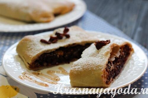 В данном рецепте штруделя с вишней используется тонкое, хрустящее тесто, которое без особых трудностей можно приготовить самостоятельно. Чтобы получить отменный результат с первого раза, уделите особое внимание этапу вымешивания теста и точно следуйте инструкции данного рецепта. Этот рецепт универсален и в зависимости от сезона, можно использовать разнообразную начинку. Ингредиенты рецепта: Для теста: Для начинки: Штрудель с вишней рецепт с фото Муку просейте в глубокую емкость. Это необходимо для большей пышности и мягкости штруделя. Влейте к муке масло и теплую воду. Добавьте щепотку соли. Начинайте вымешивать тесто с помощью ложки. Затем переложите массу на рабочую поверхность и замесите руками до плотного состояния. При необходимости добавьте немного масла или воды. Продолжайте месить тесто, периодически подбрасывая его и ударяя о столешницу. Тесто должно приобрести эластичность. Если выместить его плохо, то в процессе раскатывания пласт будет постоянно рваться. Готов