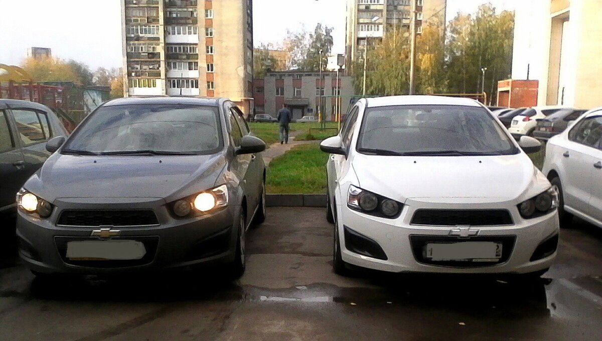Chevrolet Aveo 2014 и 2012 года выпуска. Один серый, другой белый... Две веселые овечки. Моя последняя бу-шная машина была Нива Шевроле, она пошла рыжиками, и я ее продал. Поехал смотреть новую легковушку, выбор остановил на Шевроле Авео. До сих пор не жалею о своем выборе, проехал на ней 60 тыщ, вот первый раз в конце лета в нее полезу - буду менять колодки. Дело было в конце лета, почти 3 года назад. Сижу в тачке, смотрю, - идет она, моя первая бывшая, лет 10 не виделись. Вышел, поздоровался, поболтали. Оказалось, что у нее тоже Шевроле Авео, только белая и на 2 года постарше. Пригласила она меня в гости, приехал... В общем, с тех пор мы вместе. И теперь она моя жена. Моя будущая жена покупала себе авто, исходя из бюджета в 400-450 тыщ. Смотрела и Киа Рио и Хендай Солярис, из Шевроле присматривала Кобальт. Но, когда приехала в салон смотреть Кобальт, ей предложили прошлогодний Авео со скидкой, который укладывался в ее бюджет и она не раздумывая взяла. Все таки, родственным душам д