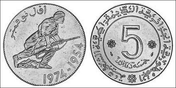 На реверсе монеты в пять динар, посвящённой 20-летию начала освободительной войны, как раз изображение алжирского муджахида.