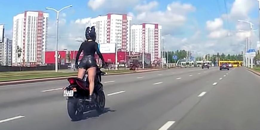 Эту девушку сложно не заметить в потоке. Сексуальные черные шортики, лишь слегка прикрывающие нижнюю честь тела девушки, такая же обтягивающая маечка и кошачьи ушки на мотошлеме. Если бы она просто спокойно ехала, то уже привлекала бы к себе внимание. Но этого ей показалось недостаточно и она устроила маленькое шоу, которое попало в объектив регистратора случайно проезжавшего мимо водителя. Он выложил видео в сеть, дополнив забавной музыкой. Это стоит посмотреть: