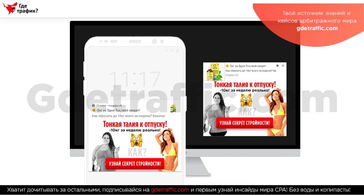 Ограничений нет — гемблинг, товарка, букмекеры, бинарные опционы и даже дейтинг. Но внимательно читайте правила. Если решили сливать на адалт или товары “для взрослых”, не раздевайте девушек на картинках догола, за это карают. Впрочем, чтобы ни у кого не возникало лишних вопросов, парни привели примеры объявлений из категорий можно/нельзя в разделе “Правила”. Вот пример разрешенных креативов.
