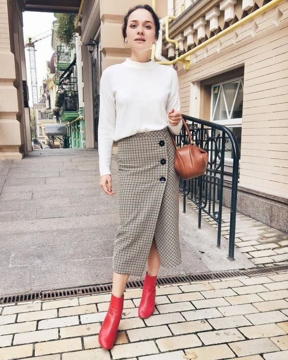 Модные блогеры - это люди, на которых равняются простые смертные в вопросах стиля. Они первыми выводят тренды в народ и задают "модный тон" на весь последующий сезон. И уж если какая-то вещь полюбилась блогерам - это однозначный успех! Так случилось с клетчатой юбкой из Zara, которая стала настоящим хитом и распродавалась в магазинах по всему миру с небывалой скоростью! Давайте посмотрим, как далеко зашли трендсеттеры в попытках перещеголять друг друга. А заодно поучимся составлять разные образы с одной и той же вещью. Образ первый. Классическое, приятное глазу сочетание белого, коричневого и красного цветов. Уютный образ, который можно носить где угодно. Образ второй. Та же юбка, та же сумочка - а итог совершенно иной! Черный аксессуары в рок-стиле и черная же футболка с принтом превращает элегантную леди в смелую бунтарку. Образ третий. Как и в предыдущем образе, юбка здесь скомбинирована с черной принтованной футболкой. В качестве акцента - рыжие сапоги. Образ четвертый. А вот опя