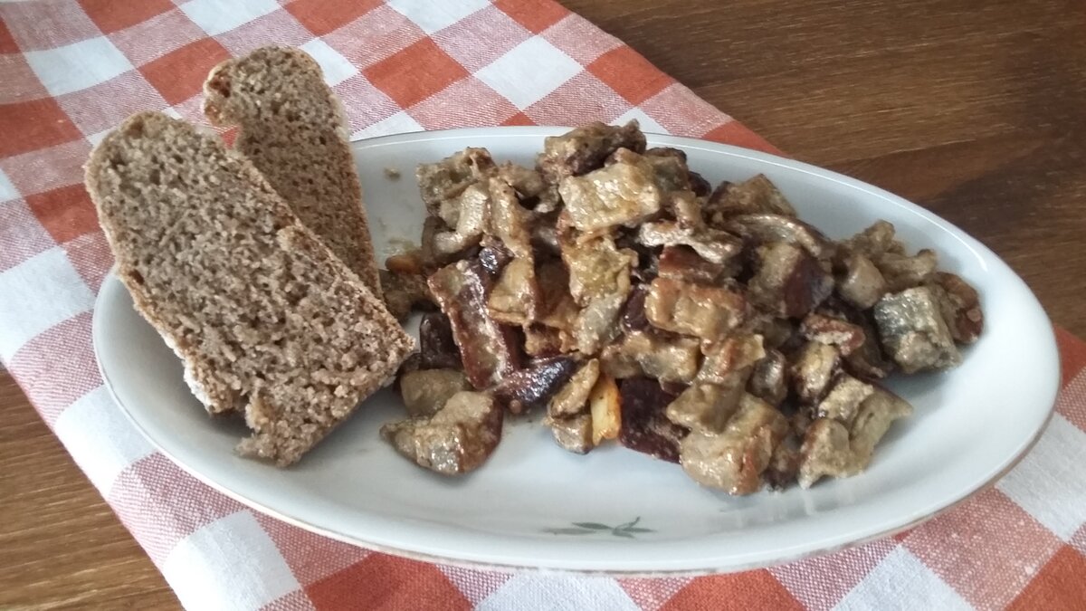 Сытный, легкий и быстрый гарнир или просто легкий перекус. Покупаем следующие продукты: Баклажаны, не крупные - 1кг Яйца - 2шт Чеснок -4 зубчика Масло растительное - 50 гр Сметана - 150 гр Соль, перец и прочие специи по вашему вкусу. И теперь, сам процесс: 1. Вымыть, очистить баклажаны от кожицы(люблю я такие, очищенные), но не обязательно, и нарезать на кусочки. 2. Взбить в большой миске 2 яйца, немного посолить и выложить баклажаны. Перемешать. Убрать в холодильник на 2 часа, не забываем периодически доставать и перемешивать. Результат выглядит вот так: 3. Разогреваем глубокую сковороду, выливаем масло, 3 минуты обжариваем чеснок. 4. Выкладываем баклажаны и жарим на максимуме до образования поджаристой корочки постоянно перемешивая. 5. Добавляем сметану, соль, прочие специи и тушим под крышкой еще минут 15 на слабом огне. По моей электрической плите, это 4-ка! 6. Снимаем с плиты, накладываем в тарелку и быстро кушаем, отгоняя любопытных домочадцев. Приятного аппетита и хорошего