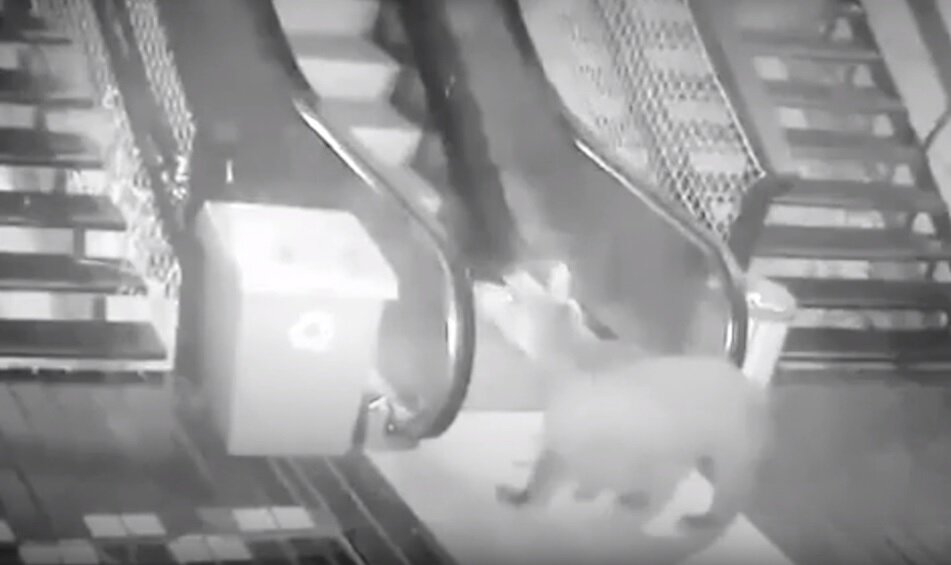 Маленький медведь пытается взобраться на безлюдный эскалатор. Все это запечатлела камера наблюдения. Мишка скорее всего спустился в гор или вышел из леса к канатной станции на территории одного из горных курортов.