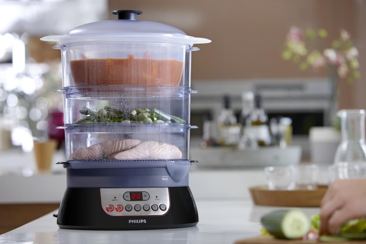 Думаю, все уже выучили, какая я ленивая хозяйка. Вечно мне подавай рецепты, на которые время тратить не надо! Но пароварка была куплена домой вовсе не с целью экономии времени и сил. Ее главный козырь - польза! Приобретена она была в момент, когда одному из членов семьи потребовалась строжайшая диета по медицинским показаниям. И большую нишу в этой диете занимали блюда на пару. Краткий смысл в том, что бульоны были запрещены, а варка, мол, "вымывает" очень много полезностей в бульон. При готовке на пару вымываться некуда, так что все полезное остается. Повторюсь: я не врач и не диетолог, за правильность информации не отвечаю. Но мы в семье просто приняли это как аксиому. Пароварка была приобретена недорогая, но на три чаши сразу! Чтоб можно было и овощи забросить, и мясо, и на крупу место осталось. В этом первый плюс пароварки: Обилие этого самого места. На один уровень я закидываю куриное филе или индейку (или котлетки), на второй - картошку, морковку и свеклу, которые можно человеку