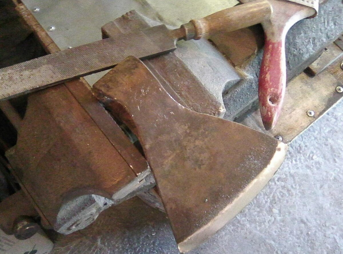 2. Положить на рабочий верстак или ровную поверхность топор на бок и прижать его к поверхности или зажать в тиски.