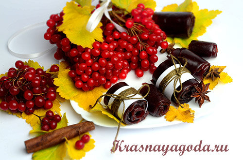 Срезав большой пучок гроздей калины, можно приготовить необычный десерт - ягодную пастилу. Забавные маленькие рулеты украсят застолье. Эти ягоды традиционно считаются лечебными, и в пастиле эти полезные свойства не исчезают. Пастила из калины в домашних условиях получится темно-красной, вкус - сладкий с ненавязчивой кислинкой. Сладости домашнего производства не содержат консервантов и прочих опасных ингредиентов. Пастила из калины иногда даже способна заменить таблетку от головной боли. Ингредиенты рецепта: Приготовление пастилы из калины в домашних условиях: Из крупноплодных сортов легче «добыть» сок с мякотью, но можно использовать и другие сорта, только придется приложить больше усилий. Ягоды снимают с веток, моют, перебирают. Сморщенные сухие ягоды годятся для заваривания чая, а пастилу готовят только из самой сочной и спелой калины. Сырые ягоды измельчают блендером. Погружной блендер совершенно не повреждает плоские косточки калины, они отделяются от мякоти и остают