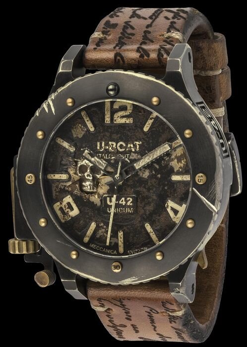 U-Boat U-42 Unicum - часы от Итало Фонтана в стиле стим-панк Часы, на циферблате которых появилось изображение черепа, представлены в массивном титановом корпусе диаметром 50 мм с черным IP-покрытием. Его дополняет вращающийся в двух направлениях безель с бронзовыми маркерами. Верхняя точка выполнена из керамики. Часы U-Boat U-42 Unicum оснащены швейцарским автоматическим механизмом с запасом хода 38 часов. Заводная головка и рычажок отпускания безеля выполнены из бронзы. Водонепроницаемость модели U-Boat U-42 Unicum, напоминающей о пиратах, составляет 300 метров.