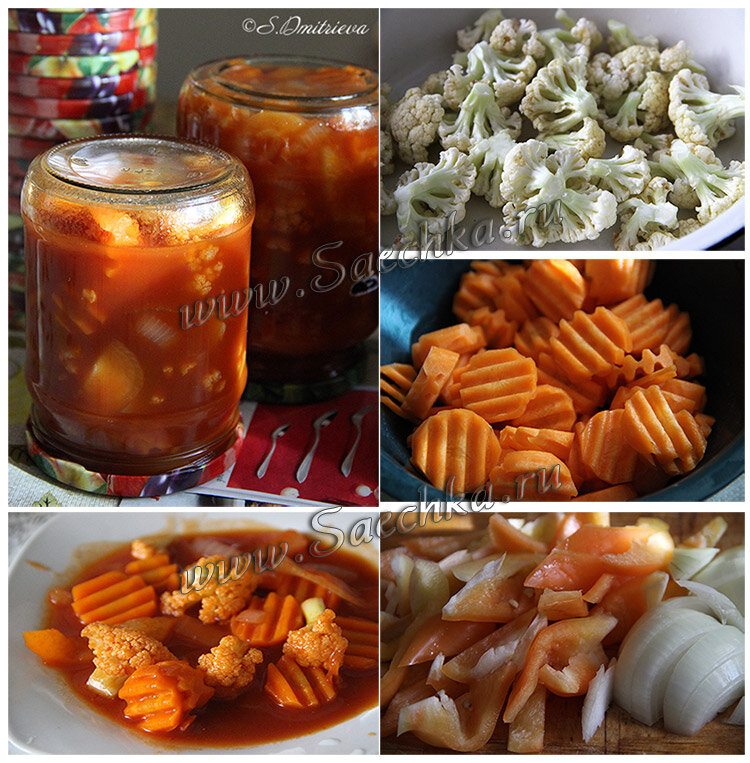 Салат из цветной капусты в томатной заливке готовится быстро и не сложно на зиму. Ингредиенты: Для двух винтовых баночек по 0,7 л: Для заливки: Как приготовить: