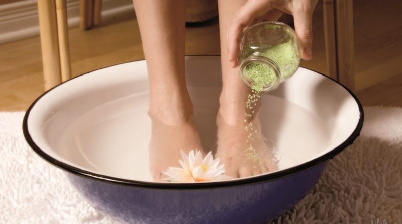 - В 2-ух литрах горячей воды растворите по одной столовой ложке пищевой соды, нашатырного спирта и немного жидкого мыла. Опустите ноги и хорошо распарьте их, а затем обработайте стопу пемзой. Аналогичные ванночки можно делать с использованием поваренной или морской соли.