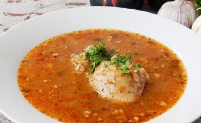Грузинский суп харчо готовится на говядине , но для разнообразия можно его приготовить с курицей и рисом получается не менее вкусный и очень ароматный остренький и пряный суп этот больше подходит для мужчин ну и для тех кто любит остренькое))) для приготовления суп харчо из курицы с рисом нам понадобится; 1) 500 гр куриного мяса ( бедер без кожи) 2) 3ст.л риса 4) 4 зуб чеснока 5) 3 ст.л очищенных грецких орехов 6) 3 ст.л соуса ткемали 7) 1 ст.л с горкой молота паприка 8) 1 ст.л хмели-сунели 9) 1 ч.л сухого острого перца либо 1/2 стручка свежего 10) 2 лавровых листа 11) 1/2 пучка свежей кинзы Растительное масло для обжарки соль, и черный молотый перец. И так начнем для начала куриные бедра требуется вымыть и снять кожу.Заливаем двумя литрами воды и ставим варить. Когда вода закипит снимаем пенку и варим приблизительно 45 минут . Когда наша курица сварится вынимаем ее из бульона отделяем мясо от косточек и кладем обратно в кастрюлю солим по вкусу. Далее промываем рис и добавляем к кури
