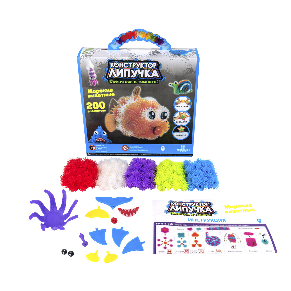 Конструктор "Липучка", "Морские животные" включает в себя шарики-репейники разных цветов, которые крепятся между собой по принципу липучки. Светятся в темноте! Элементы просто сцепляются при соприкосновении друг с другом. Можно создавать различные объемные конструкции. С помощью конструктора ребенок может осуществить мечты и воплотить смелые фантазии. Готовые фигуры легко и быстро разбираются – конструктор вновь готов к созданию новых форм. После игры в конструктор рабочее место легко убирается. Ребенок просто собирает шарики-«колючки» в большой шар, как снежный ком. Так же, ребенок может собрать любую фантазийную фигурку. Процесс скрепления деталей между собой очень прост-достаточно просто приложить шарики друг к другу, и расположенные на их концах крючки сцепят их между собой. Для создания фигурок из деталей конструктора "Липучка" не нужны никакие дополнительные приспособления и инструменты-все необходимое уже есть в наборе. Содержимое упаковки позволит создать множество потрясающих