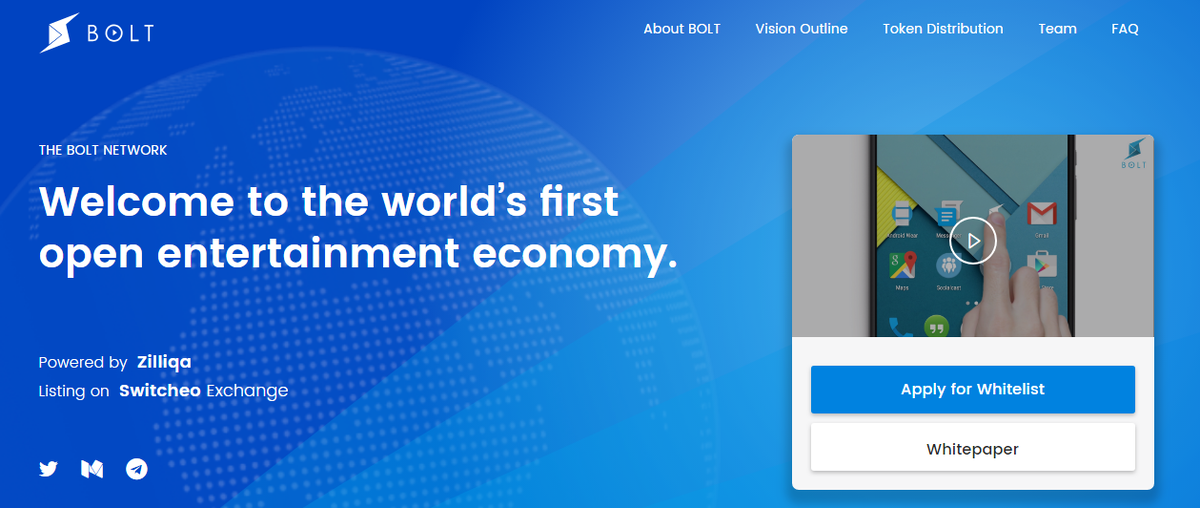 Twitter проекта: 1 792 читателя. 138 твитов. Аккаунт завели в июне и он полон видосами, сделанными в их in-house студии Bolt Originals и разными видео про ЧМ-2018 по футболу. По проекту или ICO никакой инфы там нет.