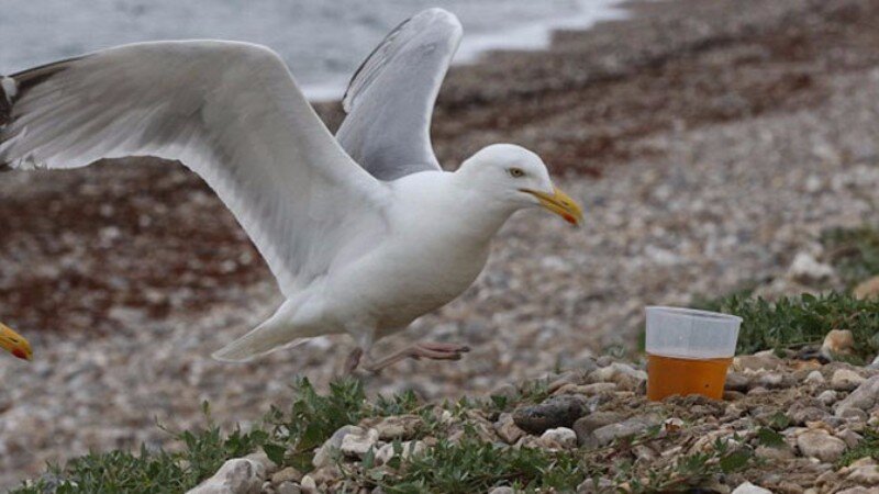 Общество по защите животных Великобритании заявило, что в нескольких графствах (Девон, Сомерсет и Дорсет) чайки регулярно начали употреблять алкогольные напитки. Систематично пьяные птицы падают с неба, а нередко их даже тошнит. В редакцию Daily Mail стали массово приходить жалобы от недовольных поведением птиц граждан. По мнению людей, чайки ведут себя слишком нагло. Только через время специалисты выяснили, в чем проблема: птицы попросту пристрастились к выпивке. В поисках воды пернатые нередко наталкиваются на оставленные отдыхающими стаканы с пивом и другими алкогольными напитками. Сейчас борцы за права животных отлавливают «алкоголиков» и отвозят в специальные центры на реабилитацию. В клиники для животных уже поступило около тридцати чаек.