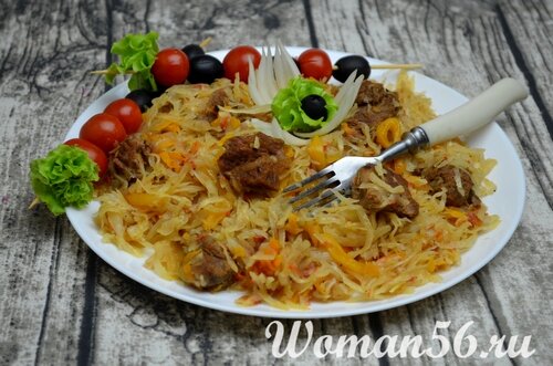 Обычная тушеная капуста с пряностями – блюдо вкусное, но особой сытностью оно не отличается. Если же тушить вместе мясо и капусту, результат будет потрясающим, особенно если выбор мяса пал на свежую говядину, а в идеале, нежную телятину. Сразу отчетливо проявляется мясное «направление вкуса», и по уровню сытности капуста уже не уступит картофелю или макаронам. Присутствие целого набора овощей добавит блюду сочности, а остроту и оригинальный привкус обеспечат прованские травы. Приготовление этого блюда в мультиварке придаст дополнительную пикантность блюду и упростит приготовление. По рецепту, блюдо желательно посыпать свежим укропом или петрушкой при подаче к столу. Тушеную капусту с мясом можно превратить в начинку для кулебяк, пирогов, блинчиков, профитролей, трубочек из слоеного теста и других кулинарных шедевров. Ингредиенты рецепта: