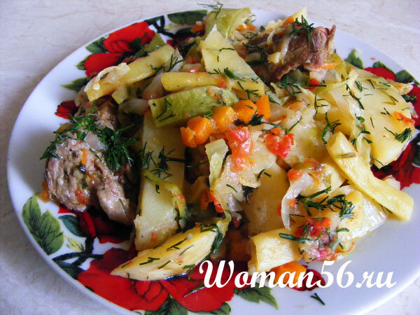 Конечно, овощное рагу со свининой хорошо готовить, в холодные месяцы года. Но в данном рецепте, используются летние, молодые овощи. Так что блюдо получается очень даже летним. Овощное рагу с мясом свинины. Ингредиенты: • свиная шейка – 0,5 кг; • лук – 1-2 шт; • морковь – 1-2 шт; • стручковая фасоль – 200-300 гр; • кабачки – 1-2 шт, • капуста – 200-300 гр; • картофель молодой – 1 кг; • помидоры (томатный сок) – 2-3 шт; • укроп; • соль, перец; • зубчик чеснока; • растительное масло. Овощное рагу с мясом свинины. Приготовление: Свиную шейку тщательно моем и разрезаем на кусочки среднего размера. Так они будут более сочными. В казан наливаем растительное масло и кладем в него нарезанные кусочки мяса. Обжариваем его со всех сторон до образования румяной корочки. Нарезаем лук полукольцами, морковь брусочками. Добавляем лук и морковь в казан с мясом. Стручковую фасоль тщательно моем, нарезаем соломкой длиной 2-3 см и отправляем в казан. Далее нарезаем кабачки на небольшие кусочки,