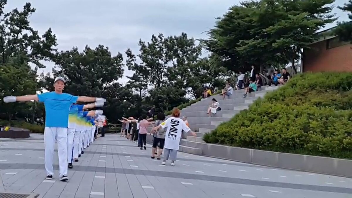 В Корее очень распространены такие танцы, которые и смотрятся и приносят пользу в виде физкультуры. Очень многие корейцы вечером, после работы, собираются в парке и отлично проводят часы отдыха. Красивые танцевальные движения, очень похожие на физзарядку, просто завораживают. Синхронные движения, точность выполнения, все это говорит о каждодневной тренировке. Самые разные по возрасту люди ходят в так называемый кружок счастья. Носят одинаковую форму, своими выступлениями показывают всем культуру Кореи и приглашают всех в свою команду. Чем больше людей будет заниматься оздоровительной гимнастикой, тем лучше. Движения, похожие на занятия восточными единоборствами, дисциплинируют и развивают дыхание. Зрителей так же собирается огромное количество. Все хотят посмотреть на выступление своих земляков и просто пообщаться. К вечеру парк заполняется почти до отказа. Это только одна площадка, а парке их много. И на каждой площадке свои развлечения. В этом видео смотрите выступление взросл