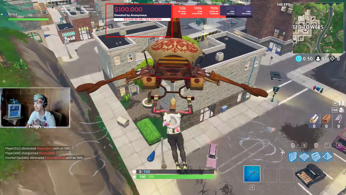 На моменте ниже вы можете увидеть донат в 100 тысяч долларов, который был отправлен анонимом стримеру под ником Ninja. Примечательно, что в момент получения доната стример даже не заметил его, но через минуту уже сидел с ошеломительным видом и не мог произнести ни слова. Также хочется отметить что к концу стрима была собрана сумма в 2.7млн долларов. Сам же стрим был благотворительный и все пожертвованные деньги отправятся на помощь детям в St. Jude Children's Research Hospital. Ну и собственно сам момент получения доната :