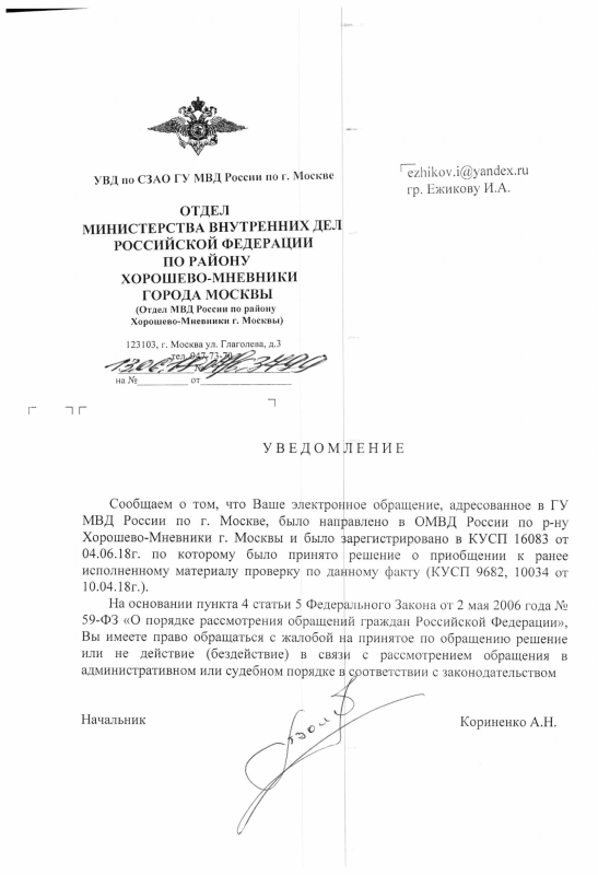ОВД Хорошёво-Мнёвники в очередной раз расписалось в своей беспомощности и ангажированности. По заявлению, содержащему совершенно железобетонные доказательства фактов совершения сразу ряда экологически преступлений, вынесен отказ. Уничтожение сотен деревьев в ООПТ и полное изменение ландшафта в зоне охраняемого ландшафта полицию не интересует, они его не заметили. Они тупо списали дело вслед за ранее вынесенным отказом. Вчитайтесь в отказ! От ДПиООСа не пришёл ответ, а на снимках "нах не виден факт вырубки", поэтому отказываем. Если кто-то из вас обращался в МВД по вот этому образцу и получил отказ - напишите мне. Если у вас отказ такой же - это совершенно незаконно, нельзя приобщить ваше новое заявление к моему предыдущему. Если он у вас другой - мне бы хотелось увидеть, какой. Если вы готовы обжаловать в прокуратуру эти отказы - я подготовлю жалобу. Если вы еще не обращались в полицию - самое время. Ситуация не изменилась, стройка продолжается. Все изложенное в заявлении - актуаль
