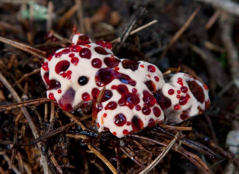 Как вы думаете, что перед вами? Вишня со сливками? Капли крови на чьих-то бледных останках? Нет, это гриб, носящий официальное название Гиднеллум Пека, а чтобы страшнее звучало, аборигены называют его Истекающий кровью зуб дьявола! Растет он в Северной Америке, но некоторые грибники уже встречают его в Европе, а недавно Зуб Дьявола обнаружили в Иране и Корее. Жидкость, выделяющаяся через поры шляпки гриба, ядовита и потому трогать ее руками (а, тем более, глотать) не рекомендуется.
