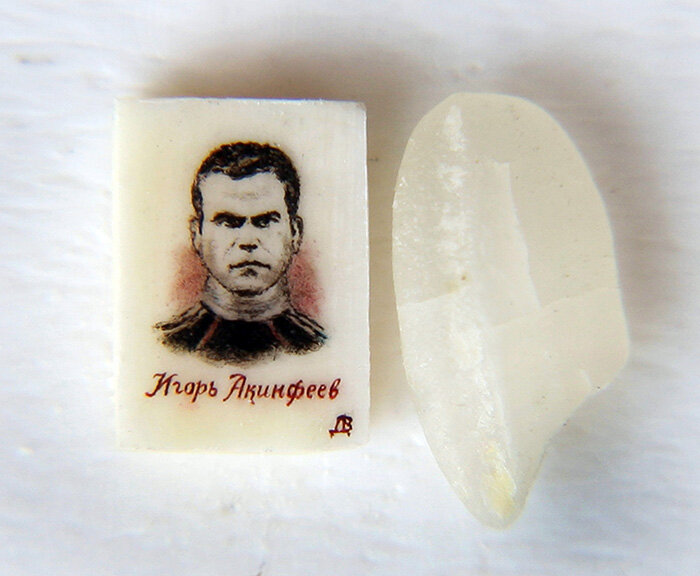 Миллиметровый вратарь Российской сборной Акинфеев и Волк Забивака - символ Чемпионата Мира-2018, а также микроскопический список футбольной команды России. Житель Череповца Валерий Дворянов создает микроминиатюры – полноценные произведения искусства размером с крупинку. В честь Чемпионата Мира по футболу в России художник создал серию микроминиатюр на кости и рисовых зёрнах. В коллекции его творений – болеее сотни различных портретов, пейзажей, надписей, фигур - и всё это с приставкой «микро». Микроминиатюрой мастер занимается уже три десятилетия. Работы Валерия Дворянова многократно демонстрировались на выставках в России, и за её пределами.
