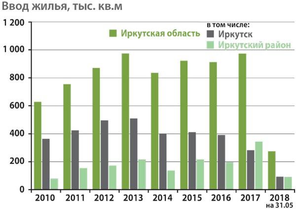 Главные показатели рынка недвижимости Иркутска за полгода в одном материале: ввод жилья, динамика цен, кол-во ДДУ, сделки на вторичном рынке, ипотека, коммерческая недвижимость. Realty.Irk.ru и Газета Дело подготовили традиционный обзор основных показателей рынка недвижимости за первое полугодие 2018 года. Каковы объемы ввода жилья в Иркутске и Иркутской области? Почему количество ДДУ в областном центре падает, а в целом по области растет? Как изменились цены на новостройки и «вторичку»? Как чувствует себя рынок коммерческой недвижимости? Об этом – в нашем материале. За январь-май 2018 года, по данным Иркутскстата, в области сдано 274,2 тыс. кв. м, из них в Иркутске – 92 тыс. кв. м и почти столько же в Иркутском районе – 90,5 тыс. кв. м. По сравнению с показателями за аналогичный период прошлого года, темпы строительства снизились на 3 % (тогда в области было введено 283 тыс. кв.м). Плановый объем ввода жилья на текущий год – 1 млн кв.м, но делать выводы о реальности выполнени