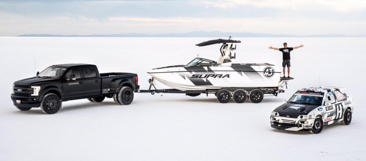 Похоже, Кен Блок не тот человек, который может просто так сидеть на одном месте. Похоже, теперь он переключился на...лодки. Если вы подпишитесь на Instagram Кена, вы поймете, что, когда он не записывает ролики Джимкхана, не участвует в ралли-кроссе, американских ралли, не катается на сноуборде, горном велосипеде, не гуляет с собаками или просто кайфует, то он занимается вейкбордингом. Поэтому он начал сотрудничать с компанией Marine Products и построил собственную Supra. Это лодка, а не легендарный японский автомобиль. Ясное дело, когда речь про Кена Блока, то рядом всегда много лошадиных сил. Катер исключением не стал. С него сняли старый двигатель и заменили его на 6,2-литровый V8 от предыдущего поколения пикапа Ford F-150 Raptor. К нему прикрутили механический нагнетатель Roush и выжали из двигателя 575 лошадей. Естественно, чтобы вынести всю эту мощь, потребовались специальные вал и винты. Чтобы отличаться от всех остальных катеров, нанесли ливрею легендарного Escort Cossie и на т