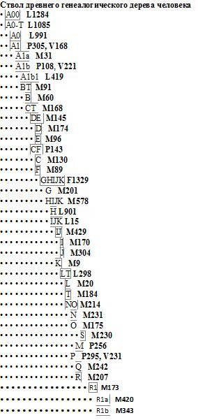 Результаты недавних исследований о происхождении человечества методами ДНК-генеалогии представлены на рисунке далее, на котором также показаны времена появления основных Y-хромосомных ветвей человечества.