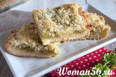 Пирог с ревенем. Ингредиенты: Ингредиенты рецепта: Пирог с ревенем. Приготовление: Оставьте сливочное масло таять при комнатной температуре, когда оно станет мягким возьмите 2/3 части масла и смешайте его с 1/2 стакана сахара. С помощью кулинарного венчика взбейте массу до однородности. При желании используйте сахарную пудру. Добавьте яйцо, смешайте все компоненты, пока они не приобретут однородную текстуру. Затем к масляной заготовке всыпьте муку, всегда при приготовлении теста муку рекомендуют просеивать - это добавит пышность и легкость любому изделию, далее легкими движениями начните замешивать тесто. Готовое песочное тесто оставьте на 12-25 минут в холодном месте. После этого тесто равномерно выложите по всей поверхности формы для выпекания и отправьте в духовку разогретую до 180°С на 12-15 минут, затем начните подготавливать начинку. Ревень необходимо промыть и очистить от тонкой кожицы, мелко нарезать, добавить сахар (1/2 стакана) и крахмал, все хорошо перемешать.