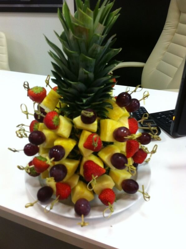 Ананас является низкоколайрийным фруктом, очень полезен для нашего организма, особенно зимой! Очень хорошо украшает ваш праздник, все столы приобретают яркое сочетание сочных и спелых фруктов, поднимают настроение и делают мир ярче! Вы можете сделать прекрасный подарок для своих родных и близких, друзей , любимым и дорогим сердцу людям! Так же вы можете передать его в качестве комплимента даме или в знак вашей симпатии! Итак, раскрою вам секрет! Покупаем 2 спелых ананас, моем, сушим, нарезаем один на маленькие дольки или ромбики, надеваем на шпажки , в дополнении к нему можно добавить красный виноград, клубнику, голубику, фейхоа и множество тропических фруктов. Это прекрасный апперетив! Радуйте себя чаще, друзья))) Приятного аппетита! Подписывайтесь на мой канал. Я буду Вас радовать необычными рецептами! А так же читайте мои предыдущие рецепты Обалденные чебуреки Яичница, Господа