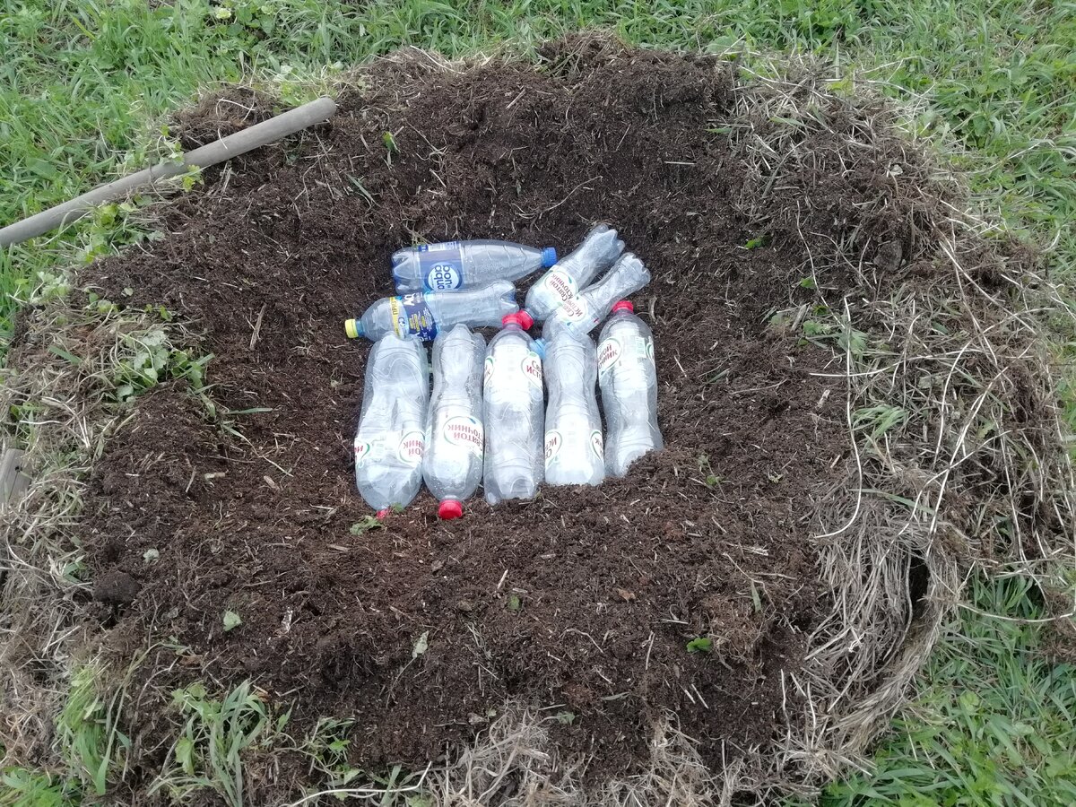2. На дно укладываю пластиковые бутылки. Можно так же уложить кирпичи, камни, любой листовой материал. Это нужно, чтобы отделить "подушку" от основной земли и не пускать корни саженцев расти вниз