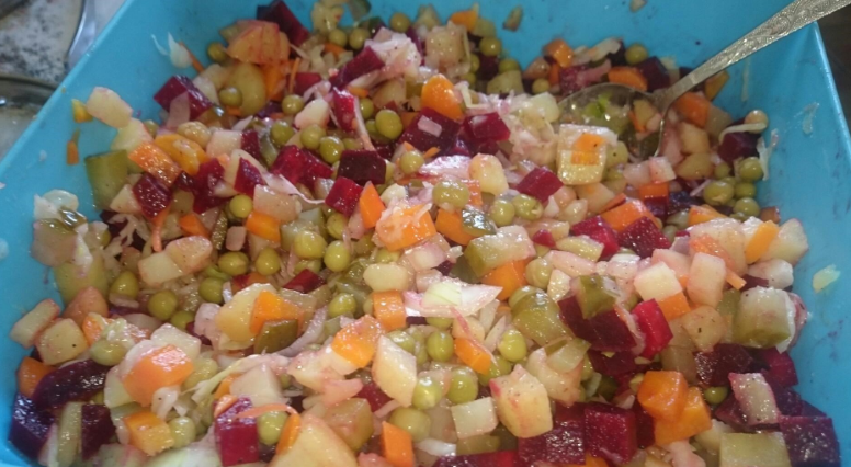 Рецепт винегрета из запеченных овощей с квашеной капустой — простой, но нескучный. Сейчас чаще всего этот салат состоит из свеклы, картофеля, соленых огурцов и моркови, но с квашеной капустой он еще вкуснее. Само название «винегрет» пришло из Франции: так (vinaigre) называется салатная заправка из горчицы, оливкового масла и уксуса. А в России традиционный прованский соус стал салатом — возможно, из-за недостаточного понимания русскими поварами XVIII века французского языка и кулинарных приемов. Ингредиенты Картофель 5 штук Морковь 2 штуки Свекла 2 штуки Консервированный зеленый горошек 100 г Квашеная капуста 100 г Соленые огурцы 3 штуки Лук репчатый 1 штука Растительное масло 2 столовые ложки Соль по вкусу Перец черный молотый по вкусу 1. Морковь, картофель и свеклу сварить до готовности, не переваривая, по возможности, очистить от кожицы и нарезать кубиком со стороной 5-6 мм. Можно также запечь все эти овощи, завернув их — каждый по отдельности в фольгу, предварительн