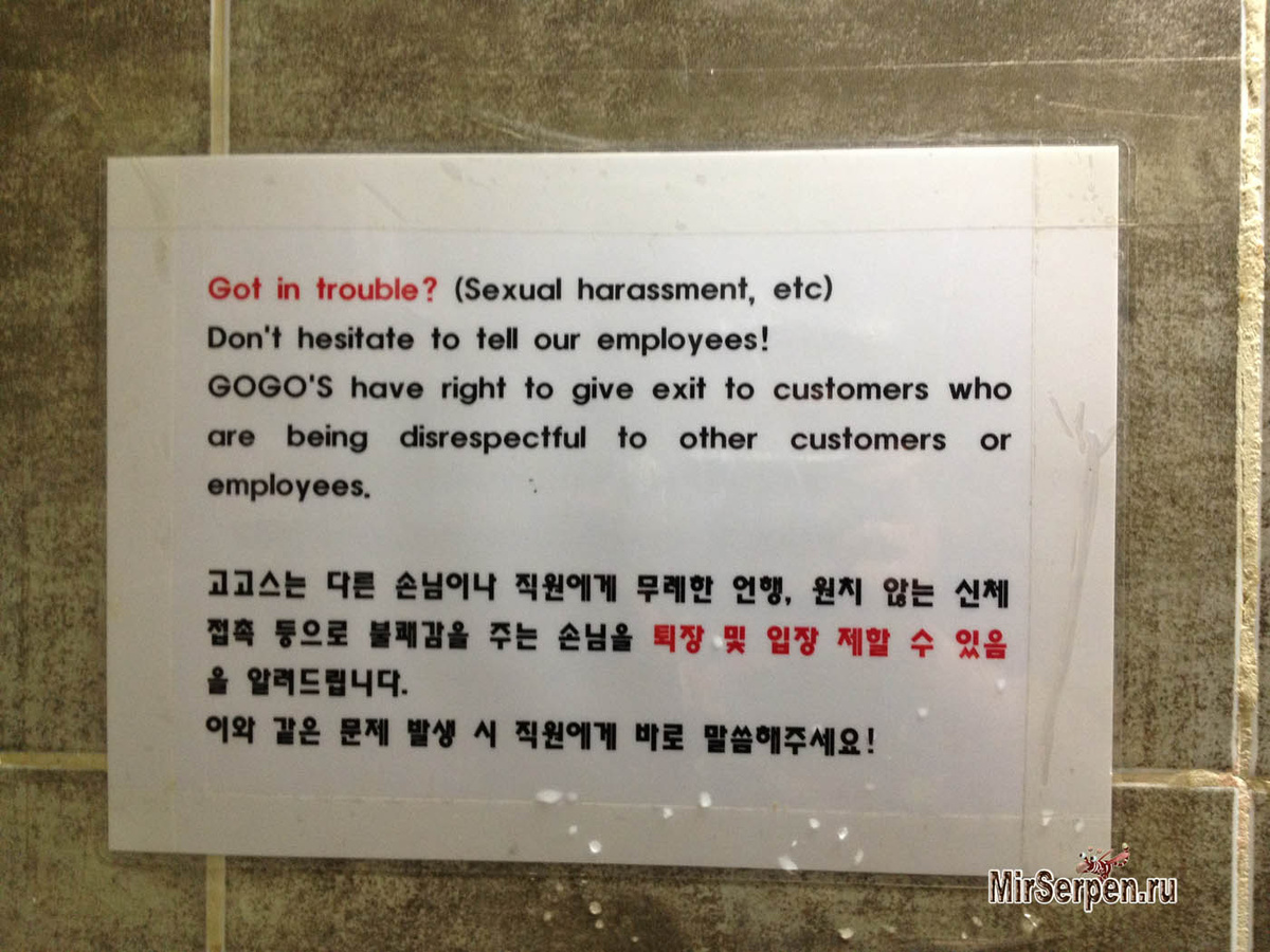Интересное объявление, в котором сотрудники заведения предлагают помощь людям, подвергнувшимся сексуальному насилию, я увидел в одном из баров Сеула. На приведенной фотографии объявление, которое я увидел в туалете одного из баров в районе Хондэ, Сеул.