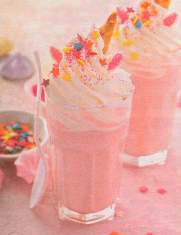 Помню, в детстве в парке аттракционов продавали изумительный молочный коктейль! Его вкус мне так запомнился! С тех пор я нигде не встретила даже похожих. Пока... не научилась готовить такое лакомство сама! Волшебный коктейль в самый раз для первого бала! Вам понадобиться: • Молоко (3,2%) - 1 л • Мороженое пломбир - 200 г • Сливки (20%) - 100 мл • Сахар - 2 ст. л. • Клубника - 200 г • Зефир - 1 шт. • Кондитерская посыпка по вкусу СПОСОБ ПРИГОТОВЛЕНИЯ: (1) Клубнику вымыть, снять хвостики. Перетереть через сито или измельчить в блендере (вместо клубники можно использовать сироп из варенья). Мороженое разделить на/ куски. Зефир нарезать крупными кусочками. (2) Соединить молоко, зефир, мороженое и взбить блендером. Добавить клубничное пюре и еще раз взбить. Разлить коктейль по креман-кам или высоким бокалам. Сливки соединить с сахаром и взбить до устойчивых пиков. Переложить массу в кондитерский мешок и аккуратно выдавить на коктейль. Сверху посыпать кондитерской посыпкой и сразу же