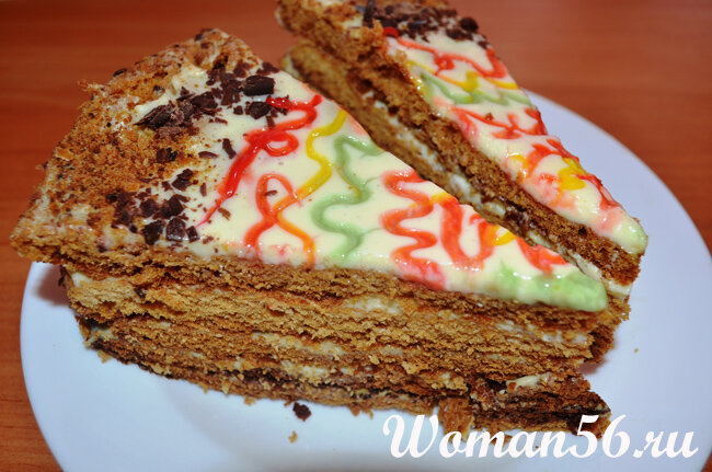 Интересно наблюдать за модернизацией классических рецептов. Технология постепенно упрощается, приспосабливаясь к стремительному ритму нашей жизни. Никто не захочет провести полдня в кухне, чтобы соорудить нечто вкусненькое. Именно таким вариантом и является наш медовый торт, рецепт с фото которого вы наверняка оцените по достоинству! Ингредиенты рецепта: Крем: Коржи: Медовый торт. Рецепт с фото. Приготовление: Сахар высыпают в глубокую тарелку, туда же добавляют яйца. Все взбивают миксером на минимальной скорости. Увеличения объема добиваться не обязательно, нужна лишь однородная масса. Добавляют сливочное масло, мед и соду. Все осторожно размешивают и ставят тарелку на кастрюльку с кипящей водой. Тарелка должна находиться на водяной бане 10 минут, пока ее содержимое не увеличится в 2-3 раза. Помешивать массу нужно постоянно. Просеянную муку порционно добавляют к остальным ингредиентам. Тесто быстро вымешивают, формируют «колобок». Он должен получиться очень мягким и мас