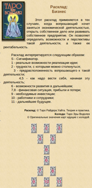 Есть свежий кейс, поэтому выкладываю его. Разбор карты "Бунтарь" переносится на завтра. Кверентка: Я про бизнес хотела бы посмотреть. Я: Хорошо, нужна ссылка на расклады? Кверентка: Наверно, нужна. У меня немного застопорился проект. Сейчас лето. Надо запускать. То у меня настроения не было, то денег (в целом инвестор должен быть привлечен или кредит, но кредит теперь муж будет на машину брать, а мне вряд ли дадут). Инвестор же тормозит. Ремонт в своем коттедже затеял. Я: В чем вопрос? Ссылка вот, 6 страниц. Кверентка: Какой путь благоприятен для скорейшего о укрытия своего бизнеса? А то сейчас это просто квартира в жилом фонде. Я: К сожалению, в такой формулировке принять не могу. Слишком расплывчато. Кверентка: Пока скину сюда несколько версий. 1) Расклад "бизнес" 2) Тайна Жрицы Я: "Бизнес", кстати, я делал раньше. Кверентка: Интересно. Картинки новые - яркие. Сравню позже. Не хватило сил все 6 страниц просмотреть. Взгляд замыливается. Давайте на 1 варианте остановимся сегодня? Я: